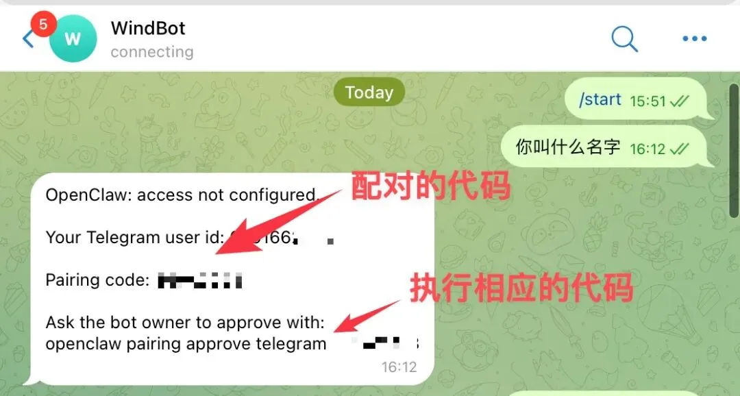 openclaw pairing approve telegram <pairing code> ,就完成了账号的配对。