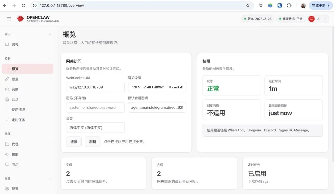 现在你就可以和 OpenClaw 用 Telegram 聊天了。你也可以打开网页版的控制面板,默认在 http://127.0.0.1:18789/ 查看到相关的信息。