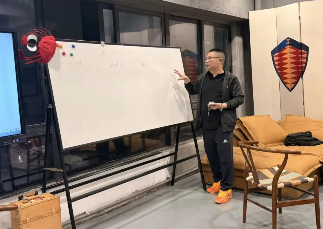 另一张经典画面:讲者再次冲到白板前,手持马克笔指着“启动化41”“案例”“收入”,台下或记笔记或录视频,认真又带劲。