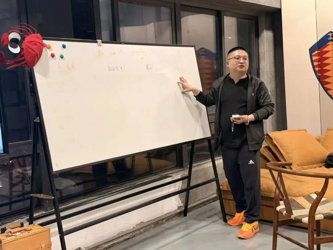 核心分享环节照旧硬核。一位黑衣橙鞋的技术大佬站在巨型白板前,继续激情输出。白板关键词“No one is coming”、“今天发展”、“启动化41”、“案例”、“收入”……直击痛点:第二次聚会,大家不再停留在“怎么装”,而是深入聊Skill研发与落地、安全性防护、真实创业路径。