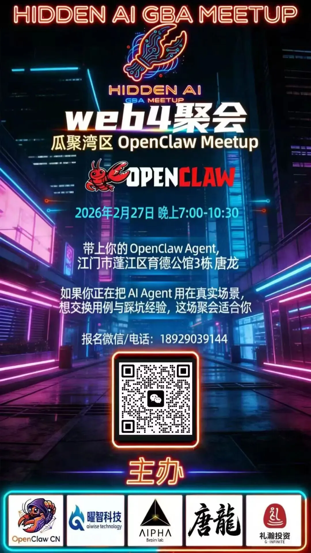 2026年2月27日晚,江门蓬江区育德公馆3栋唐龙,“HIDDEN AI GBA MEETUP”——OpenClaw大湾区第二次线下聚会如约而至。这次不是“开荒”,而是延续首届(大年初四那场)的火热势头,把更多开发者、创业者和AI玩家拉进同一个空间,一起把OpenClaw Agent从概念推向更真实的商业与生活场景。