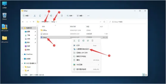 2.打开解压出来的Office2024文件夹,继续打开Setup文件夹,选中Setup程序,右键以管 理员身份运行!