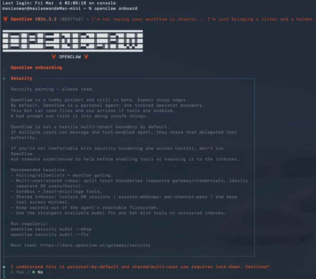 OpenClaw 默认是给个人用的,如果你想让很多人共享使用(比如团队协作),就需要做好安全限制。对于个人使用者来说,直接选默认就行。