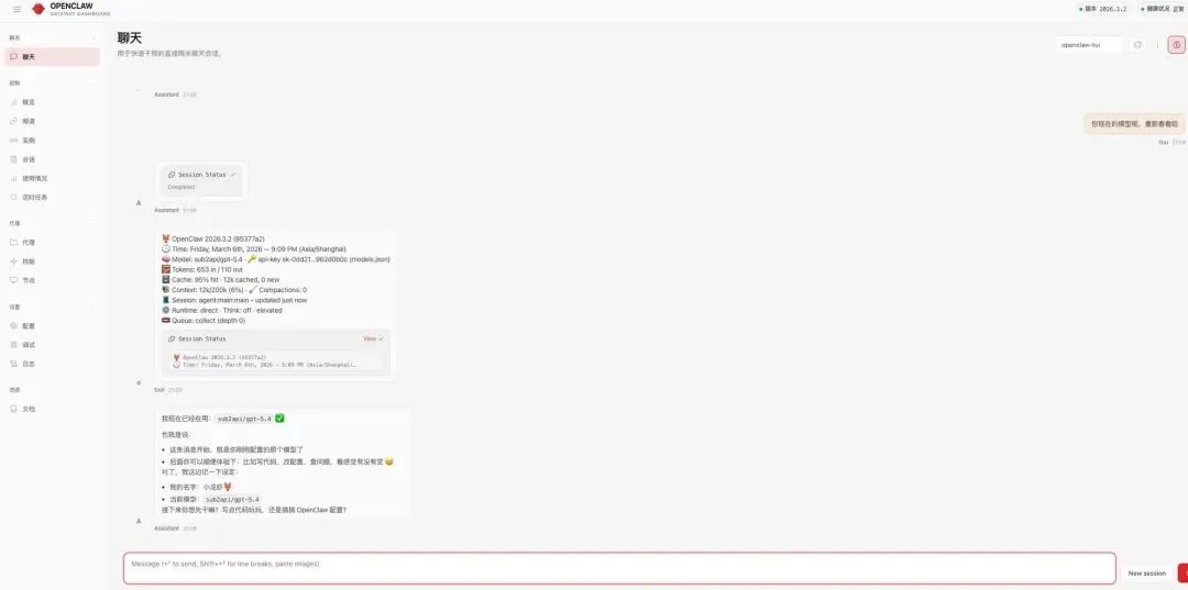 openclaw config set agents.defaults.model.primary "openai-codex/gpt-5.4"重启 OpenClaw 后,问它“你是什么模型”,就会回复 gpt-5.4: