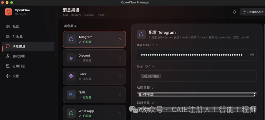 每个渠道的配置界面都做得挺清晰的,比如Telegram要填BotToken,飞书要配置AppID和Secret,照着提示填就行。而且还能设置私聊策略、群组策略,甚至飞书还支持多部署区域选择