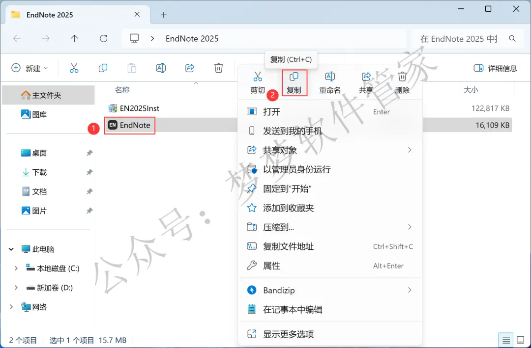 回到EndNote 2025文件夹,找到【EndNote】文件,再右键点击【复制按钮】