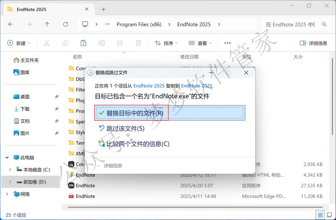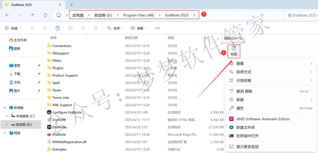 14、打开软件安装位置,步骤9可查看,路径为:D:\Program Files (x86)\ EndNote 2025,再右键文件夹的空白处,点击【粘贴按钮】