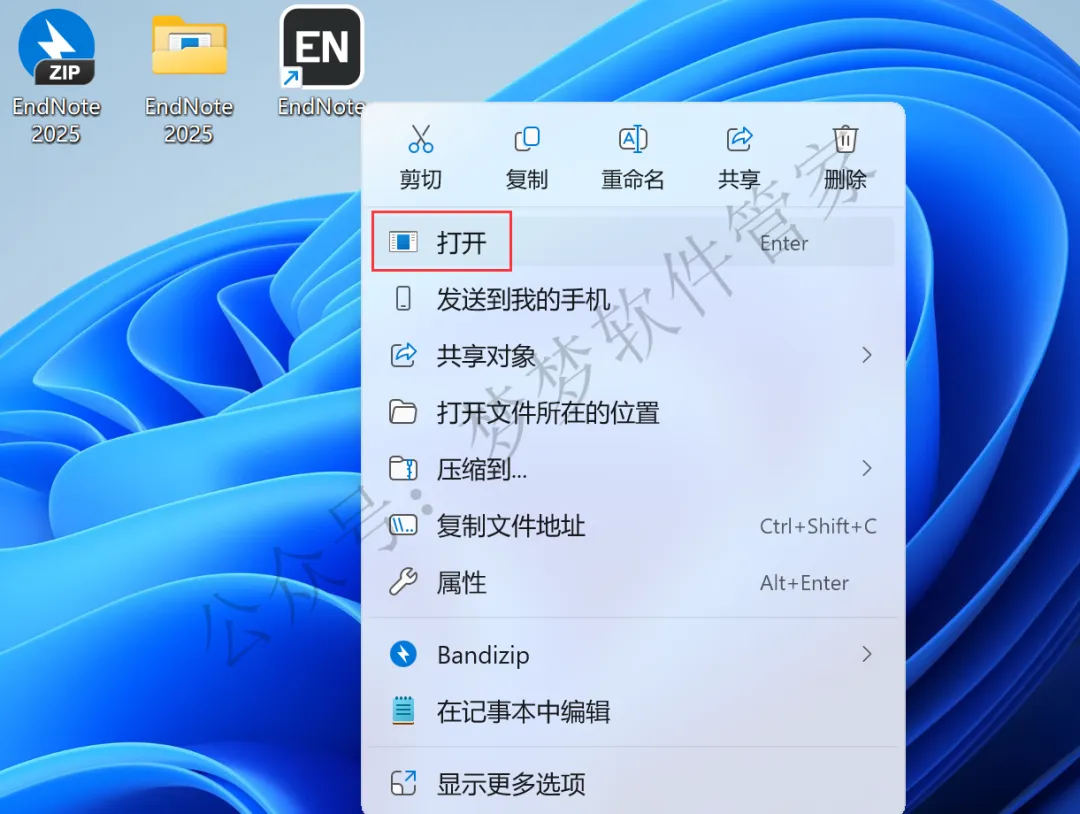 回到桌面,右键桌面上的【EndNote】图标,点击【打开】
