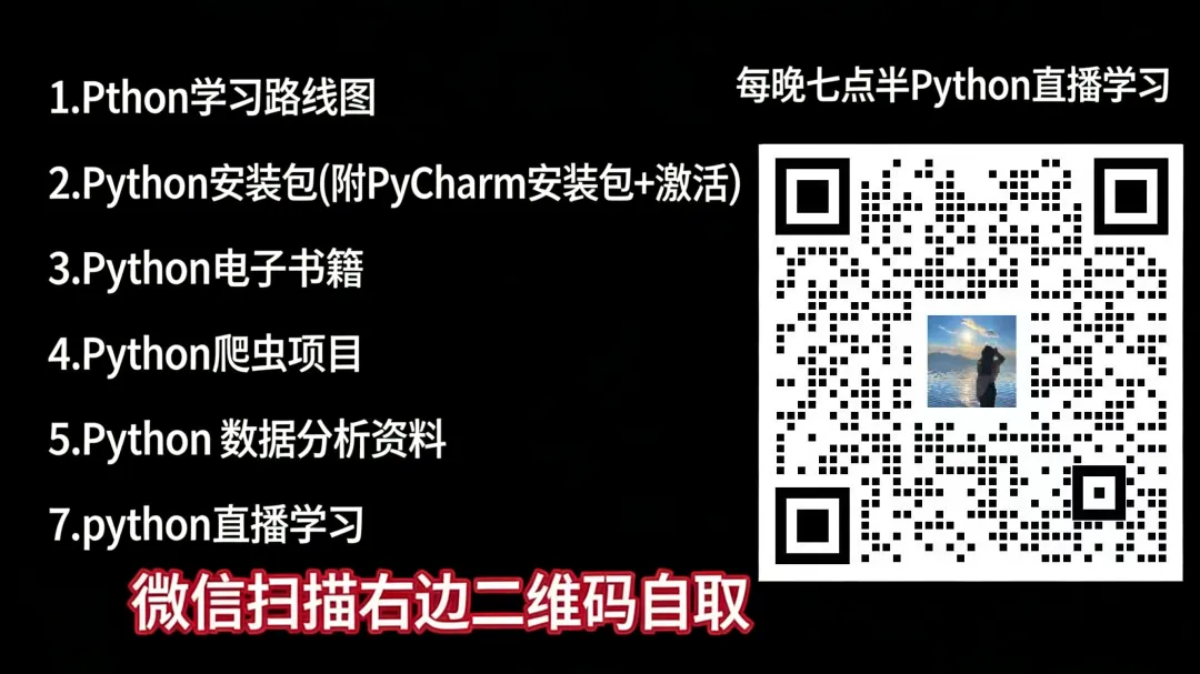 如果你正在学习python,这些Python资料、数据分析、Python从入门到实践第三版pdf书籍、Python+Pycharm安装包&永久激活插件、直播课程,可以在这里免费领取哈👇