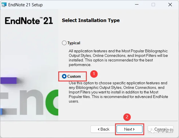 8、勾选【Custom】,再点击【Next】