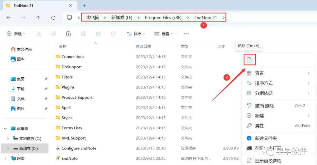 18、打开软件安装位置,步骤9可查看,路径为:D:\Program Files (x86)\ EndNote 21,再右键文件夹的空白处,点击【粘贴按钮】