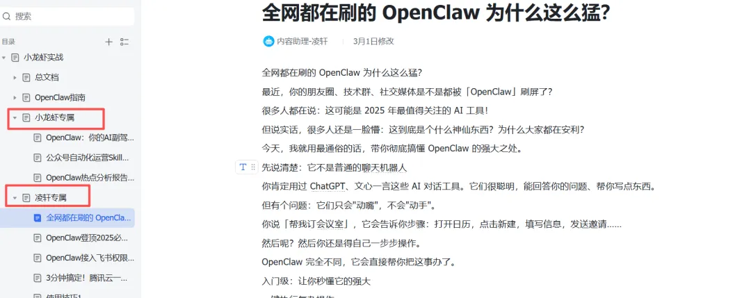 我有个小技巧,在飞书知识库里,给每个助理建一个目录,让它以后输出的飞书文档都保存在这个目录下。