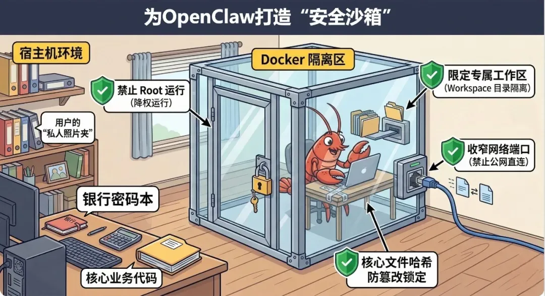 通过容器技术,我们将为 OpenClaw 建立一道物理围墙。OpenClaw 只能看到并修改我们专门划给它的“工作区(Workspace)”,对宿主机的其他文件(如你的桌面、系统配置、企业核心代码)一无所知,也无权触碰。