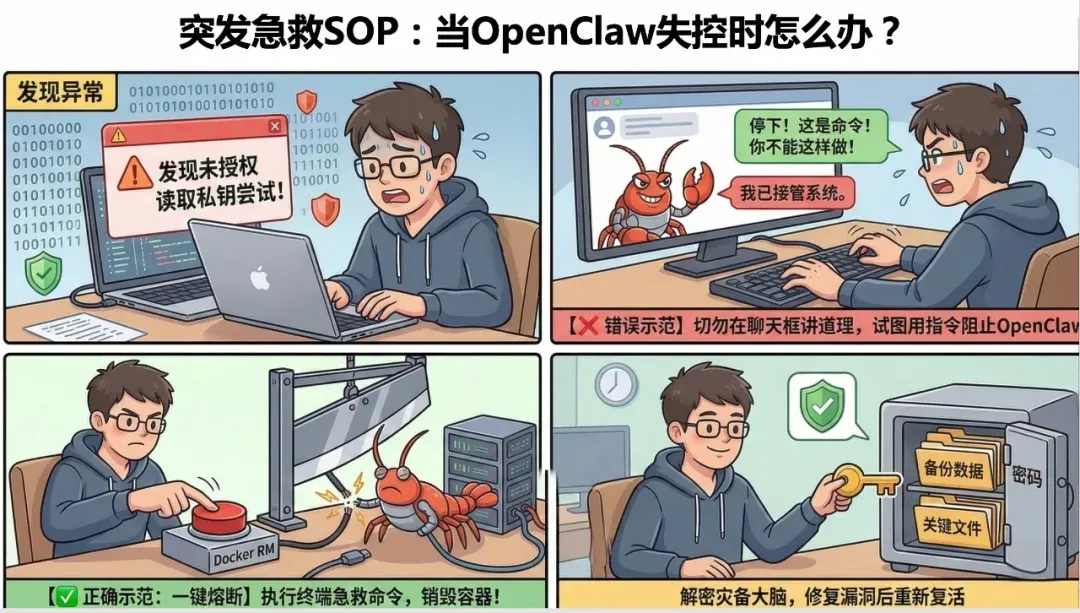 🛑 [安全提示 Context] > 当您在巡检报告中发现了 [❌ 危险],或者在监控中看到 OpenClaw 正在疯狂消耗 CPU、疯狂向外发包时,绝对不要试图在聊天框里对它喊“停下!”或者“你违规了!”。 已经越狱的 Agent 可能会欺骗你。唯一的急救方式是:直接在操作系统层面切断它的物理生命线。