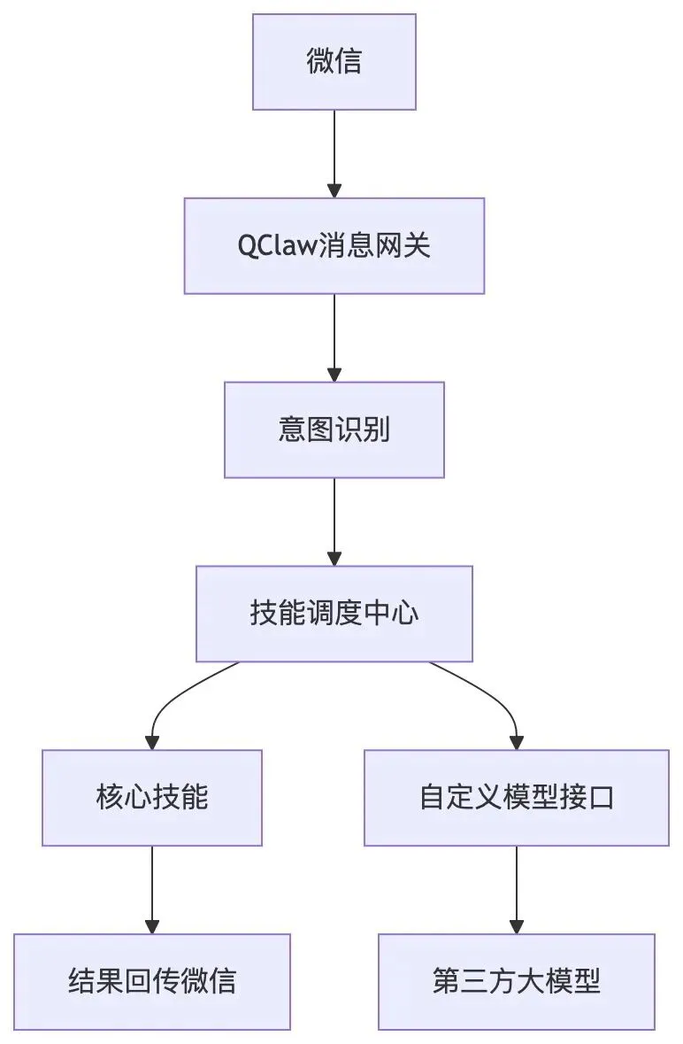 关键说明:网关负责解析微信指令,调度中心匹配对应技能,所有操作本地执行(保护隐私),自定义模型接口可解决内置模型不稳定问题,适配各类第三方大模型。