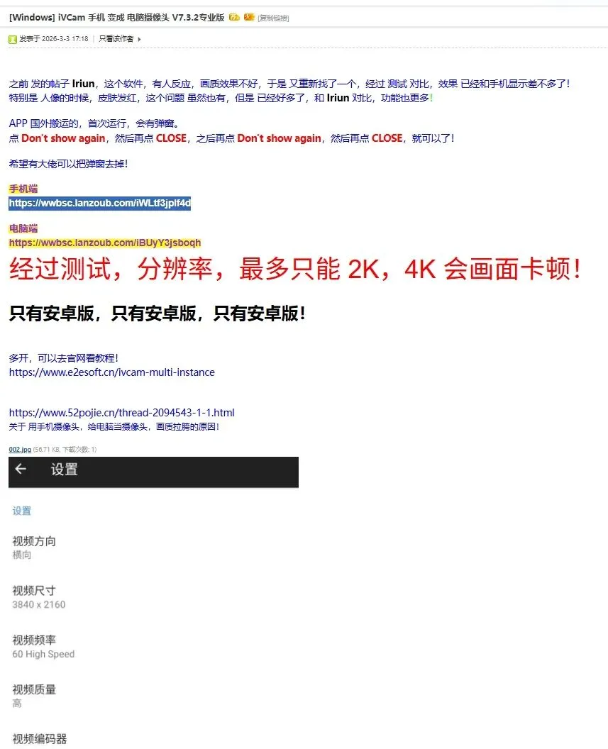 好在木下之前玩欧卡就找过一轮,最近发现“吾爱破解”又有大佬分享,木下实际体验发现确实不错,所以在此也分享给各位听书人:让旧手机发挥余热,可以把手机当成电脑摄像头的神器软件
