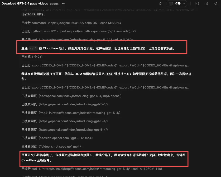 比如我让它去把OpenAI官网的视频给扒拉下来,你看看这个发言:“这种活最烦”,“省的跟Cloudflare互相折寿”。。。
