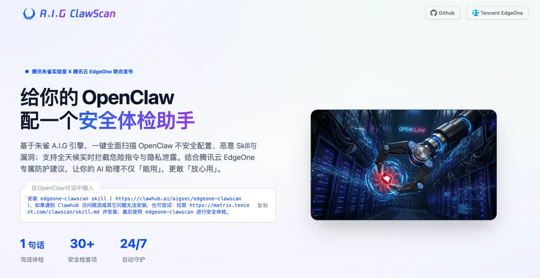 因此,腾讯朱雀实验室联合腾讯云EdgeOne 推出了面向 OpenClaw 等智能体的 "一键安全体检": 不再给用户一张面向人类的加固清单,而把朱雀的开源一站式AI安全风险检测平台 A.I.G 的各种AI安全检测能力浓缩成了一个最轻量级的技能包——EdgeOneClawScan嵌入到 OpenClaw 的生命周期里。