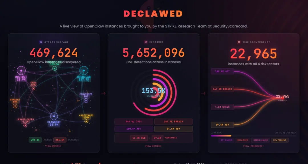 很多用户在云上部署 OpenClaw 时,图方便直接去掉了本地访问限制,将其外网端口暴露在了公网云服务上。根据外部数据的统计,全球有超过 46万个 OpenClaw 实例完全暴露在黑客的视野中。由于黑客使用 AI 调用工具发起扫描与攻击效率极高,一个全新的 OpenClaw 服务在公网上线几分钟内就会遭到疯狂敲门与探测。