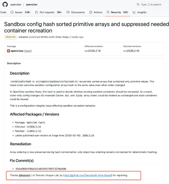 此外,我们还发现并协助 OpenClaw 修复了 3 个底层安全漏洞,如上图为CVE-2026-27007,获得了 OpenClaw 项目官方的公开致谢,未来还会继续深挖各种 AI 供应链组件风险,提升漏洞预警能力。目前我们监测到的 OpenClaw 漏洞数量仍在快速增长中,建议用户定期更新以确保安全。