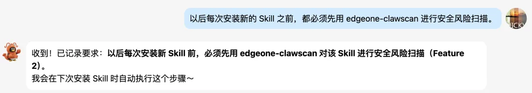 💡 “以后每次安装新的 Skill 之前,都必须先用 edgeone-clawscan 进行安全风险扫描。”