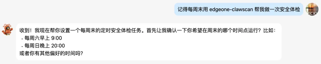 此外你还可以自由探索如“每周末用 edgeone-clawscan 帮我做一次安全体检”、“帮我看看 xxx 这个Skill安全吗?”等各种使用方法。