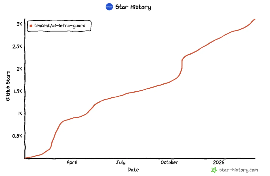 自2025年初开源至今,朱雀实验室的A.I.G(https://github.com/Tencent/AI-Infra-Guard)已在Github上获得了超过3200个Star,并有20多位社区贡献者与多个高校与企业参与共建。