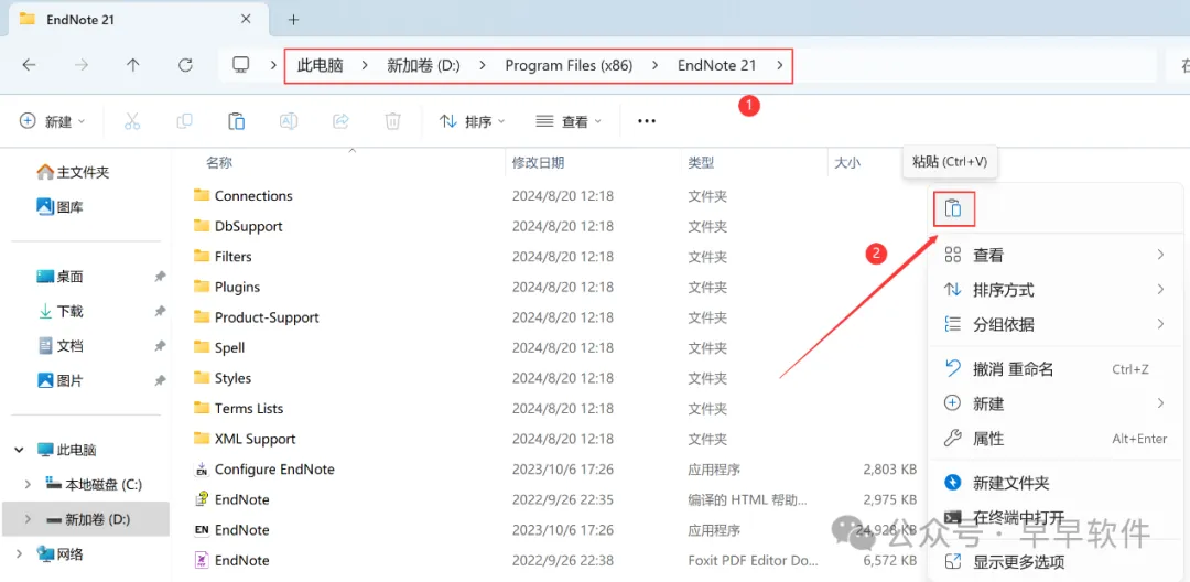 14、打开软件安装位置,步骤9可查看,路径为:D:\Program Files (x86)\ EndNote 21.2,再右键文件夹的空白处,点击【粘贴按钮】