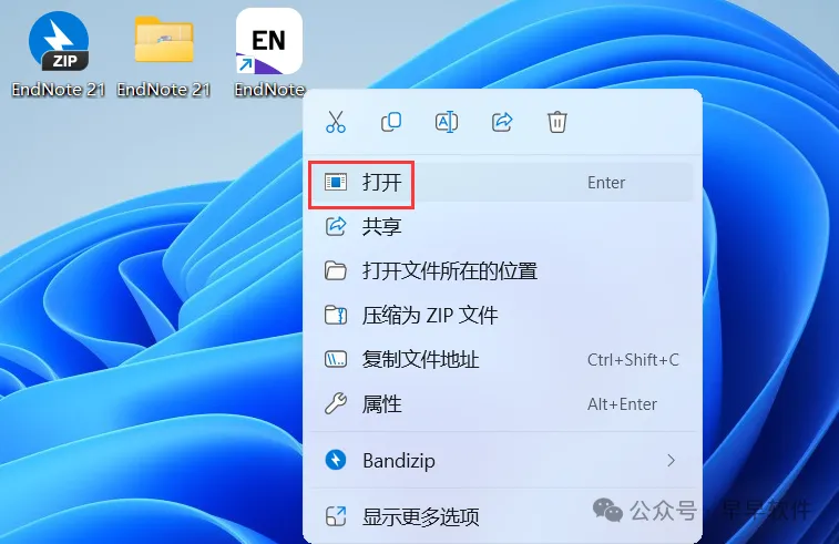 21、右键桌面上的【EndNote软件图标】,点击【打开】