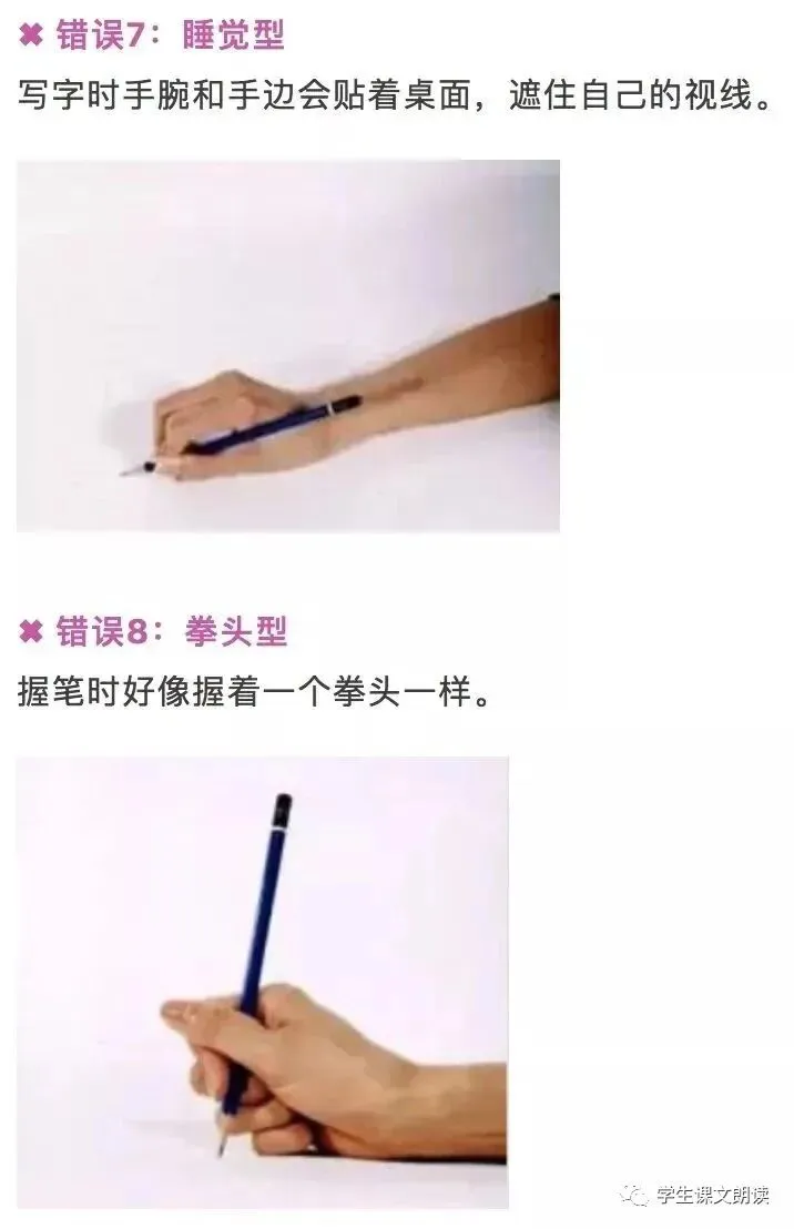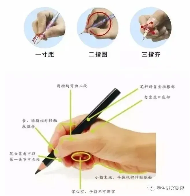 规范书写姿势应保持“一尺、一拳、一寸”。即眼睛与书本距离应约为一尺,胸前与课桌距离应约为一拳,握笔的手指与笔尖距离应约为一寸。