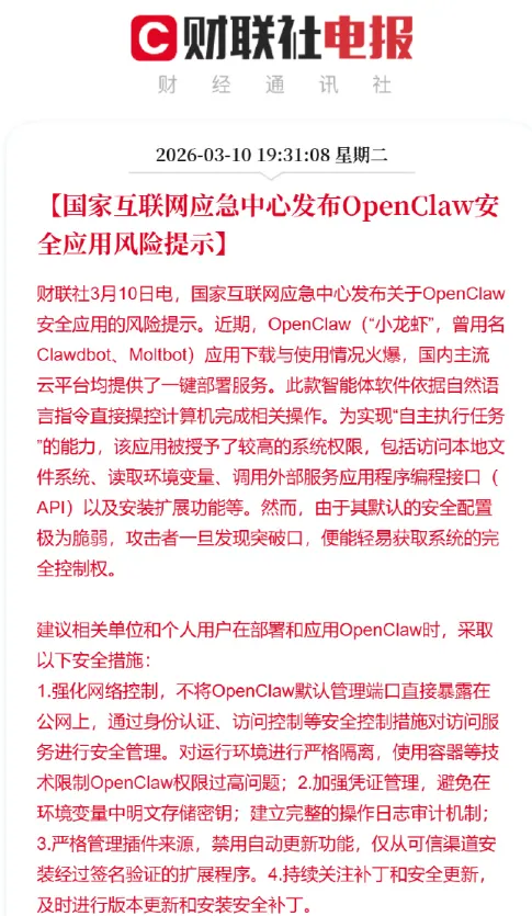 3月10日,国家互联网应急中心紧急发布风险提示,指出OpenClaw存在四大严重安全风险: