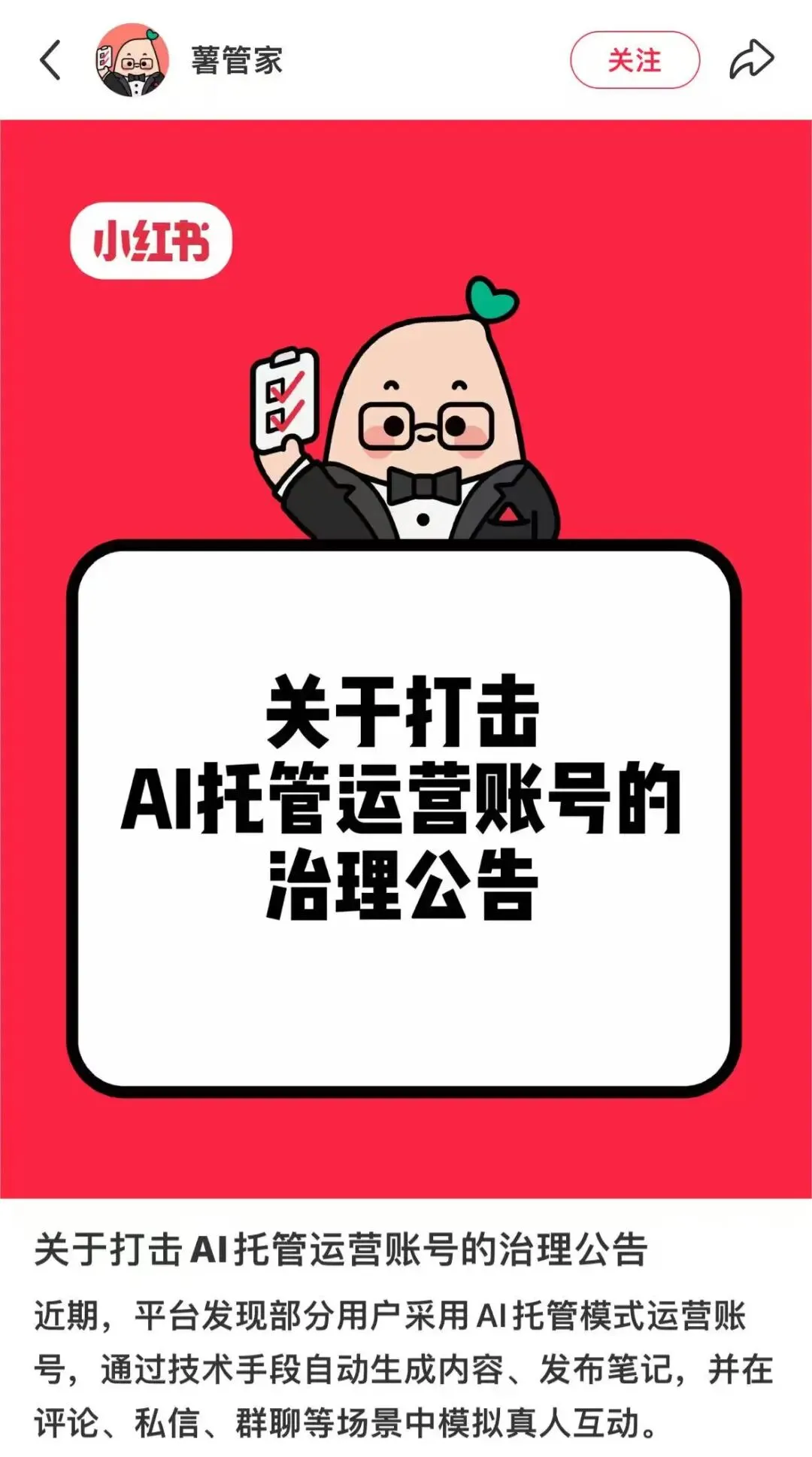 对于直接通过AI托管工具注册、或主页所有公开笔记均为AI托管代发的账号,直接予以封禁。微信、抖音等平台的反垃圾机制也早已将类似的大规模自动化内容生成列为重点打击对象。
