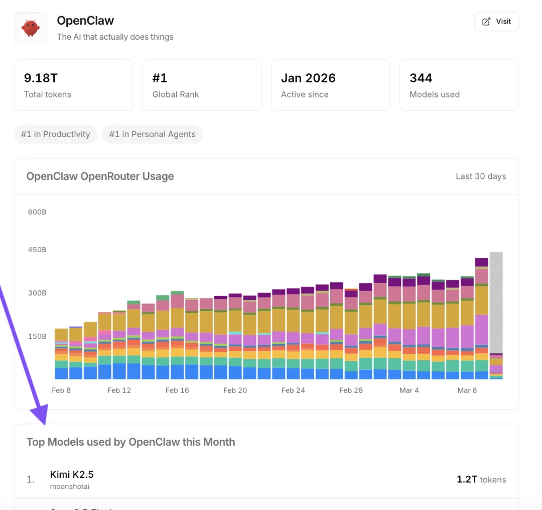 对大模型厂商来说,跟上OpenClaw这波热度,赚的不止吆喝,还有账面上的真金白银。以Kimi为例,其K2.5模型凭借对OpenClaw的快速适配和高性价比,被OpenClaw官方在1.30版本后列为首个免费主力模型,并登顶OpenRouter平台OpenClaw模型调用榜。