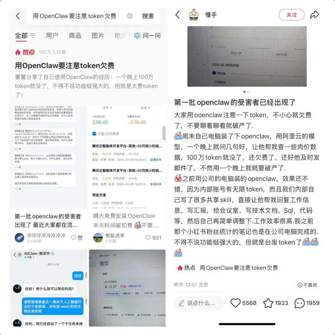 花钱安装OpenClaw只是氪金第一步,能“用得起”才算得上真正的养虾。小红书上很多网友晒出账单表示“没聊几句就欠费了”,一时间“用OpenClaw要注意token欠费”成热点话题,网友调侃“养龙虾”不如招个研究生,毕竟“能工智人”可比人工智能便宜多了。