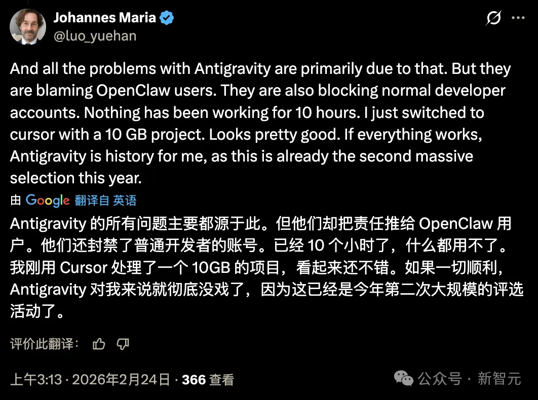 部分用户发现自己不仅被踢出了谷歌 AI IDE Antigravity,连带着绑定的 Gmail 等核心服务也一并被锁。