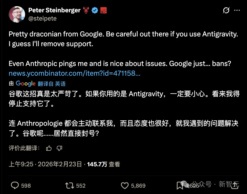 面对这种级别的封锁,Peter Steinberger 的回应同样决绝,他立刻宣布 OpenClaw 将在此后的版本中彻底剔除对谷歌架构的支持。