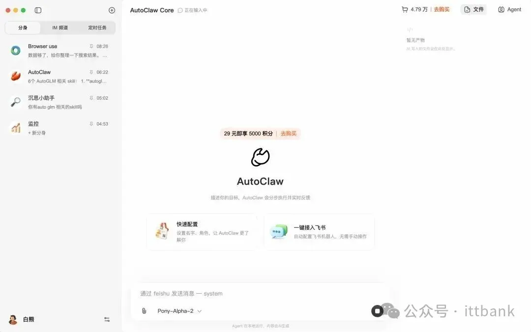 ▲AutoClaw体验界面截图当赠送的2500积分消耗完之后,用户可以自行购买积分套餐。入门包29元,为5000积分;标准包109元,为20000积分;进阶包为249元,为48000积分;旗舰开发包为499元,为100000积分。同时,AutoClaw对第三方模型完全开放,支持任意模型的Coding Plan或API,并推荐DeepSeek、Kimi、MiniMax、GLM等主流模型。针对不同任务需求,平台也推出了多档付费积分包。AutoClaw内置了智谱专为OpenClaw场景优化的模型——Pony-Alpha-2(内测代号)。该模型在工具调用稳定性、任务推进效率及响应速度方面均有提升,尤其适用于Skills调用、定时任务和持续执行等实际工作流。经大量真实场景测试,它在处理OpenClaw典型乃至复杂任务时表现优异。目前,Pony-Alpha-2内测版已面向AutoClaw及部分GLM Coding Plan用户开放试用,正式版本即将发布。同时,AutoClaw集成了智谱自研的AutoGLM Browser-Use能力(操作浏览器),可稳定完成多步骤、跨页面的浏览器操作,自动串联网页动作,实现长链路自动化任务,弥补了OpenClaw在复杂浏览器操作方面的短板。AutoClaw封装的50余种主流Skills与API接口,免去了用户单独配置搜索、图像生成等接口的麻烦,号称从安装到实际使用几乎无门槛。这些Skills覆盖内容创作、办公、代码、营销、金融等高频场景,无论是社交媒体内容一键生成发布、根据产品需求文档搭建网站,还是文档处理、代码架构、金融投研分析,均可由智能助理一站式完成。OpenClaw正从开发者的“DIY玩具”加速走向大众消费者的“即用型工具”。智谱推出AutoClaw,将模型能力、Skills包与IM入口深度整合,试图降低普通用户“养龙虾”的门槛。正如中国工程院院士、阿里云创始人王坚在两会期间接受采访时所说,OpenClaw会很快便宜下来并普及。当一键安装、预制Skills成为标配,这不仅是对“一人公司”概念的实质性支撑,更预示着AI应用生态正在经历从模型层到工具层的价值重构。专心专业专注