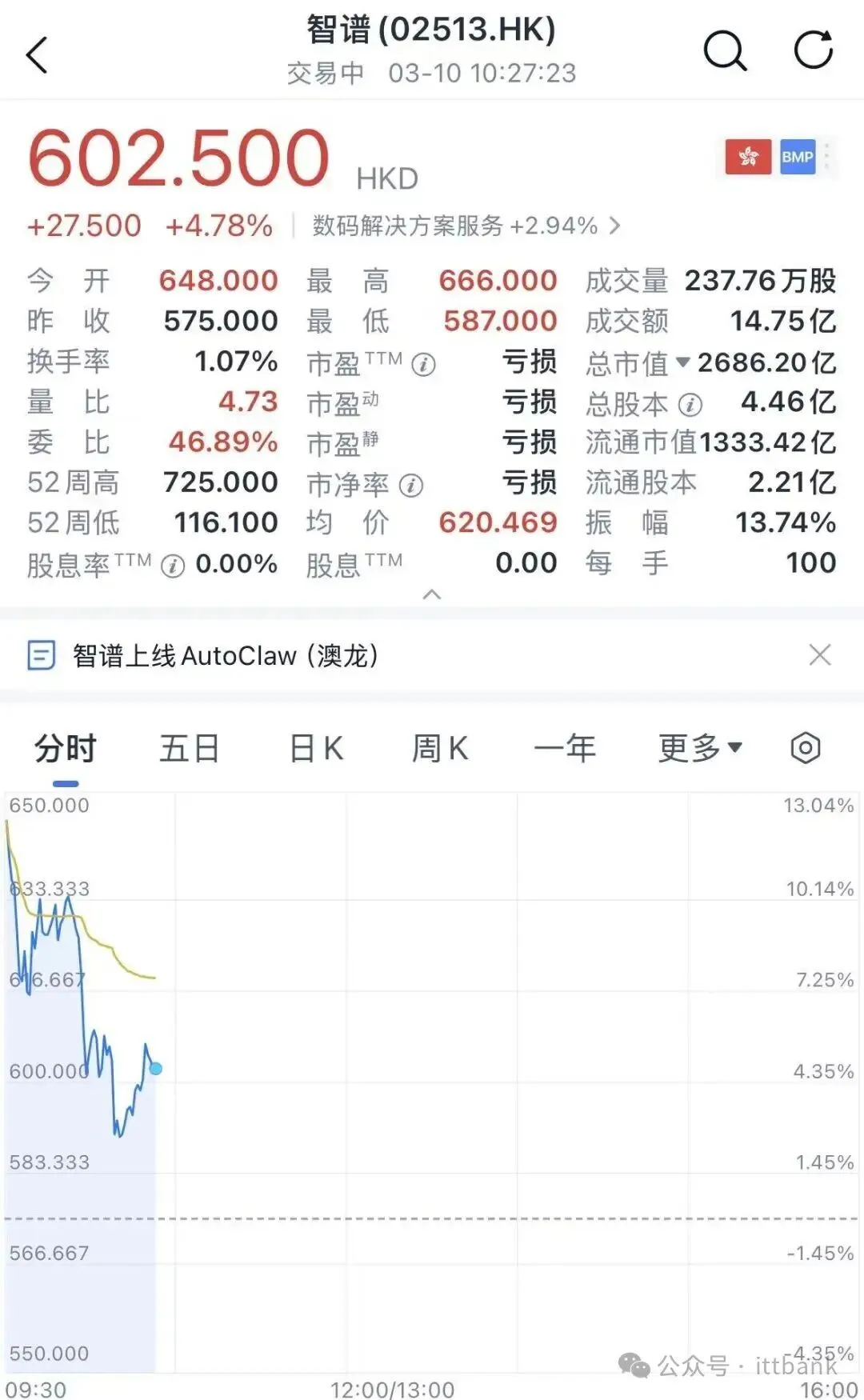 “龙虾(OpenClaw的昵称)”火遍全球,但配置对普通人来说非常难。前有“499元上门安装”赚得盆满钵满,后有鹅厂门口帮忙安装排长队。全国政协委员、360创始人周鸿祎在上周末接受采访时提到,360要发一个一键安装的版本。现在,智谱已经提前行动了。用户只需花费一分钟,即可在个人电脑上部署属于自己的“龙虾”,可免费试用,并且面向DeepSeek、Kimi等第三方模型完全开放。智谱今日开盘大涨12.6%,报648港元(约合569.97元人民币)/股;开盘后股价有所回弹,截至10点27分,报602.5港元(约合530元人民币)/股,上涨4.78%,总市值2686.2亿港元(约合2362.97亿元人民币)。▲智谱股价走势(图源:腾讯自选股)