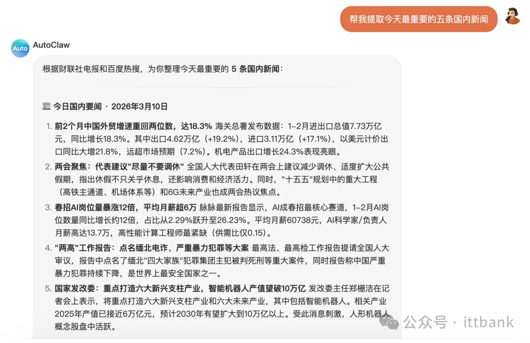 ▲AutoClaw快速配置页面值得一提的是,AutoClaw内置了智谱专为OpenClaw场景优化的模型——Pony-Alpha-2,该模型在工具调用稳定性、任务推进效率及响应速度方面均有提升,高适配OpenClaw典型场景,预计晚点发布正式版。https://autoglm.zhipuai.cn/autoclawAutoClaw的安装过程与普通App无异,同时支持macOS和Windows系统。安装完成后,AutoClaw全自动接入即时通讯工具,用户可直接在聊天界面中向智能助理分配任务。智谱为每位用户提供免费试用额度,号称“让用户0成本体验核心功能”,而市面上同类云端服务通常需要预先支付月租。智东西第一时间体验了AutoClaw,发现在像下载App一样下载完AutoClaw之后,1分钟简单配置后,我就可以通过对话方式让AutoClaw为我干活。如下图所示,我让其“帮我提取今天最重要的五条国内新闻”,其在一分钟之内给出了这些新闻,消耗了39个免费积分。