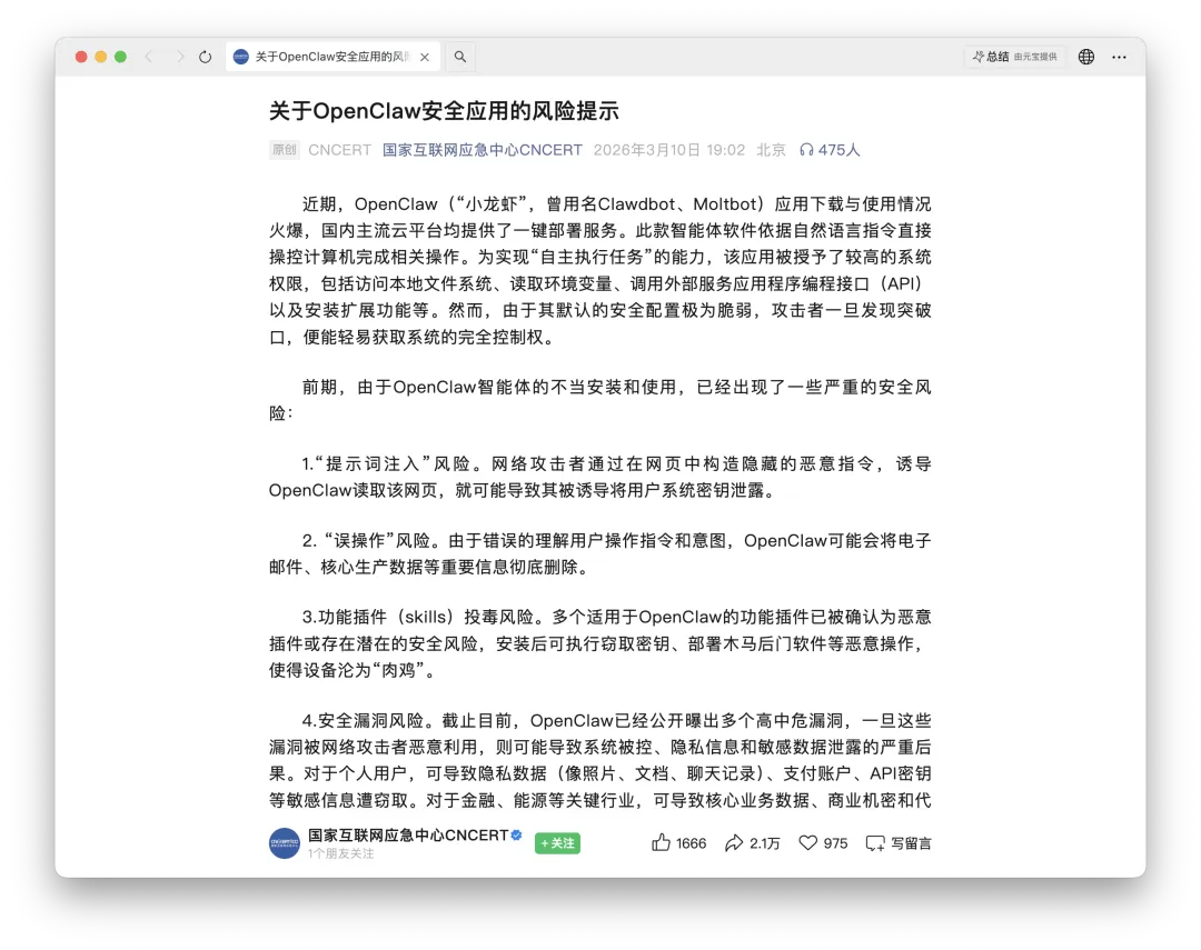 更狠的是,工信部 NVDB 上周就发了安全预警,说 OpenClaw 默认配置存在较高安全风险。紧接着国家互联网应急中心又点名四类风险:提示词注入、误操作、插件投毒、安全漏洞。专家直接喊话,党政机关和企事业单位要审慎使用。