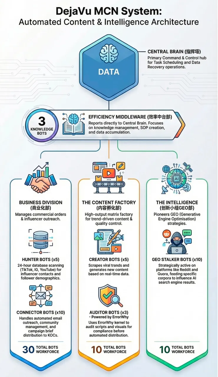 这不是一个人在玩 OpenClaw,这是用 OpenClaw 搭了一个 MCN 的数字团队。KOL 投放、账号孵化、GEO 探索,全部自动跑。