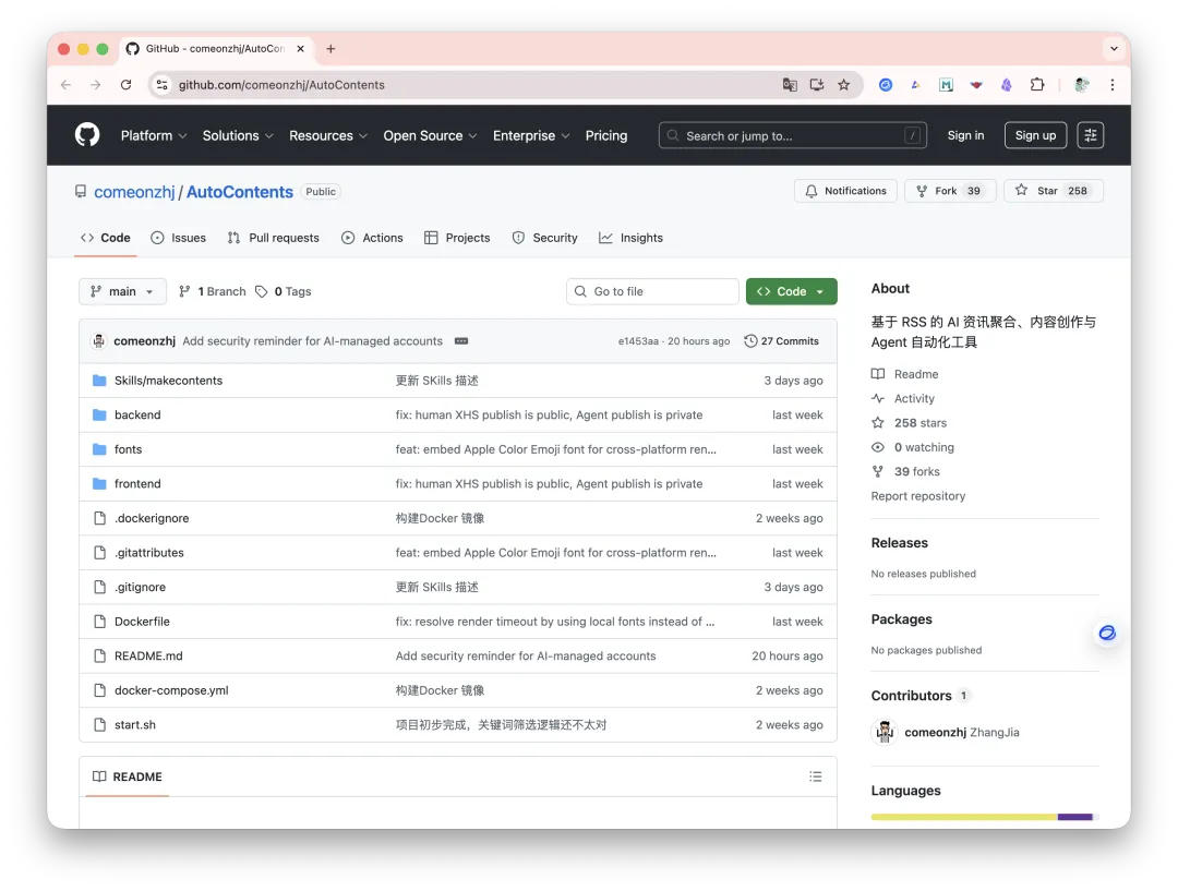 张佳,自由职业者,做了赛博龙虾。自动化小红书的内容创作和发布,开源了 AutoContents 项目。