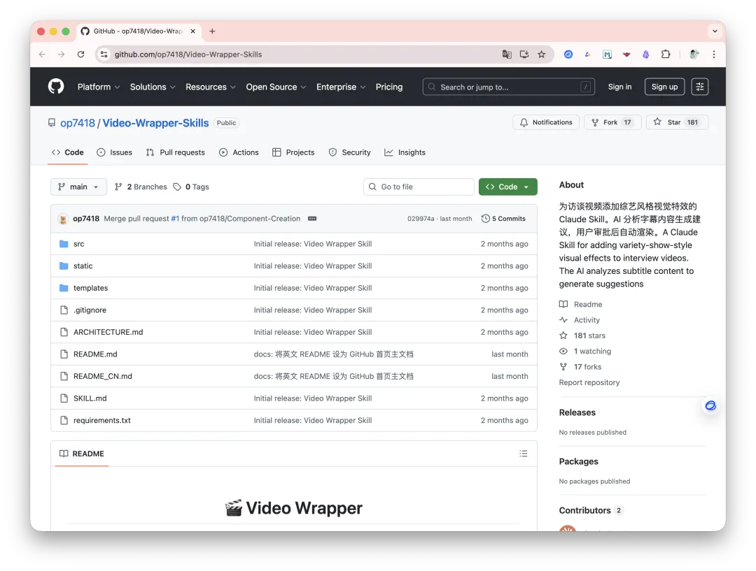 Video-Wrapper,给访谈视频加综艺风格的视觉特效,AI 分析字幕内容生成特效建议,你审批一下它自动渲染。