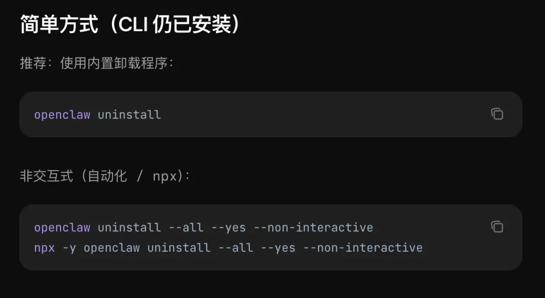 • 直接使用内置卸载: openclaw uninstall• 或者停止网关服务、移除服务注册、删除状态目录、再移除 CLI