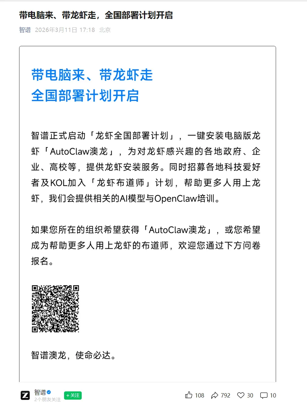11日下午,智谱AI官方宣布启动“全国龙虾部署计划”,一键安装电脑版龙虾 [AutoClaw澳龙],为对龙虾感兴趣的各地政府、企业、高校等,提供龙虾安装服务。