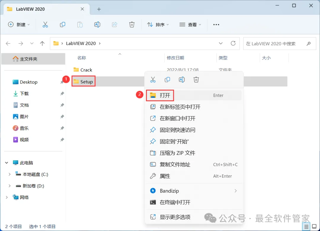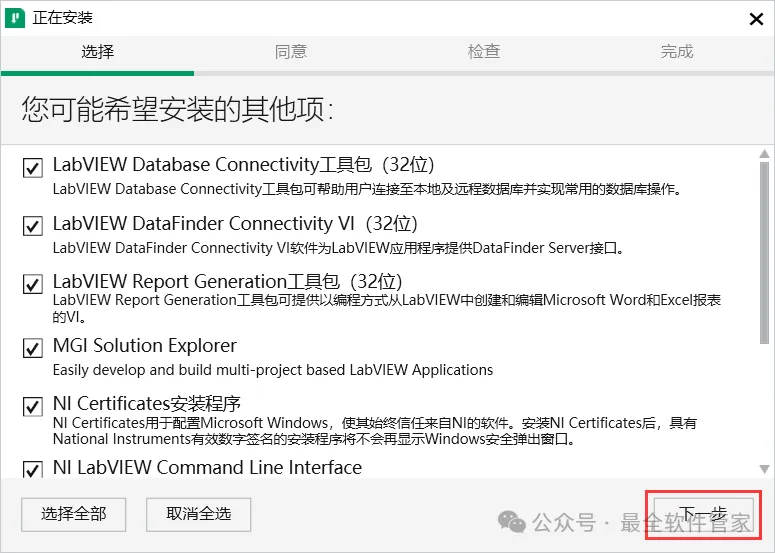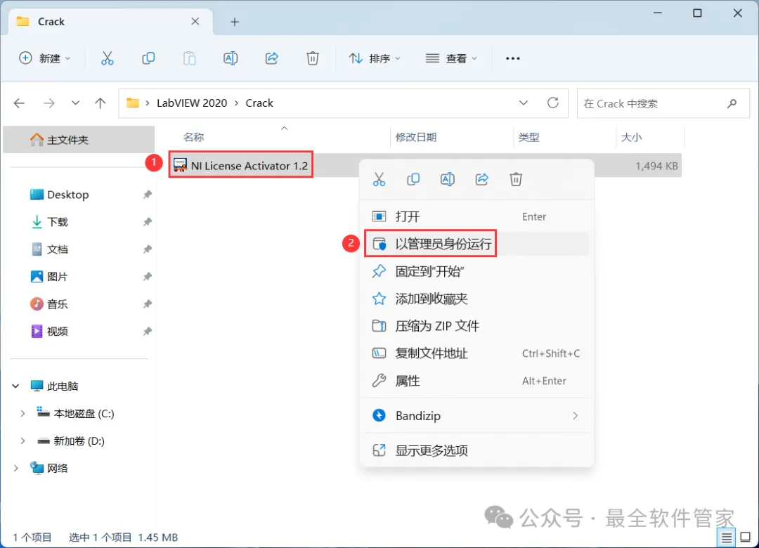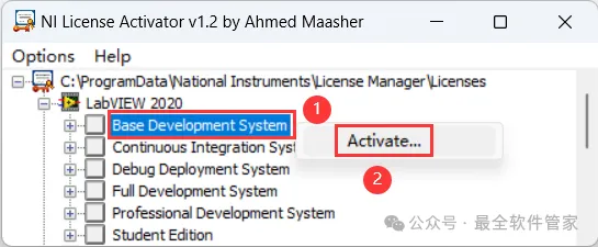 [不限速下载]:免费获取百度网盘不限速下载工具。公众号内回复:不限速[注意事项]:安装前请关闭网络、杀毒软件和防火墙,否则易安装失败。公众号内回复:1[解压软件]:小编用的解压软件是Bandizip,获取Bandizip软件安装包。公众号内回复:21、下载LabVIEW 2020软件安装包到电脑上,右键选择【解压到LabVIEW 2020\】4、找到【Install】应用程序,右键选择【以管理员身份运行】它 11、回到LabVIEW 2020文件夹,找到【Crack】文件夹,右键【打开】它12、找到【NI Lincese Activator 1.2】应用程序,右键选择【以管理员身份运行】它 13、右键全部未选中的选项,点击【Activator】15、回到桌面,点击任务栏的【开始菜单】,在【所有应用】中找到【NI LabVIEW 2020软件图标】,将软件图标拖到桌面上,完成软件桌面快捷方式的创建16、右键桌面上的【NI LabVIEW 2020软件图标】,点击【打开】 19、以上就是LabVIEW 2020软件安装的全过程,要是对你有帮助的话,请为小编点个赞! 免责声明:软件资源均来源于网络,仅供用户交流学习与研究使用,版权归属原版权方所有,版权争议与本公众号无关,用户本人下载后不能用作商业或非法用途,否则后果均由用户承担责任;如果您访问和下载此文件,表示您同意只将此软件用于参考、学习而非其他用途,否则一切后果请您自行承担,请于下载后24小时内删除,不允许用于商业用途,否则法律问题自行承担。如果您喜欢该软件,请支持正版软件,购买注册,得到更好的正版服务。