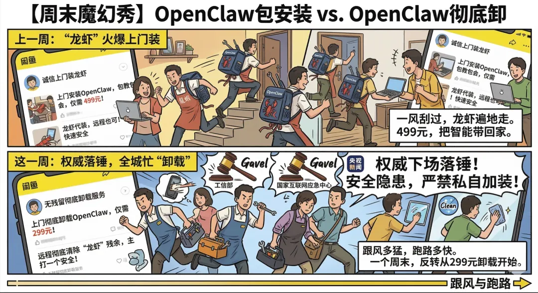 龙虾还没火过一个礼拜!工信部、国家互联网应急中心、央视新闻纷纷下场落锤!闲鱼前阵子全是代装龙虾,现在全是卸龙虾服务,远程卸、上门卸,主打一个安全无残留。从上门安装OpenClaw包会使用仅需499元,到上门彻底卸载OpenClaw仅需299元,大反转只需一个周末。跟风有多猛,跑路就有多快,感慨万千!