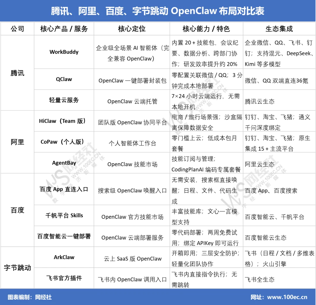 OpenClaw的爆火,不仅点燃了大众和市场的热情,也吸引了国内各大科技大厂的关注,一场围绕AI智能体赛道的布局大战悄然拉开帷幕。作为国内科技行业的风向标,腾讯、阿里、百度、字节跳动等13家科技大厂,纷纷加快布局步伐,推出适配OpenClaw的相关产品和服务,试图抢占这一新兴赛道的先机。