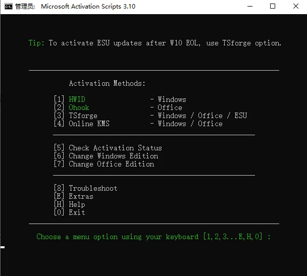 irm https://get.activated.win | iex运行后系统会出现选项界面。