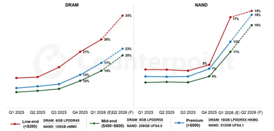 很多人会疑惑:既然手机内存因AI爆发而缺货涨价,为什么厂商不加大产能、多生产一些来缓解供应紧张? 首先,内存生产线投资巨大、建设周期长。一条先进晶圆厂从规划、建设到量产,需要近两年时间,无法快速补上当前缺口。▲智能手机存储成本占比预估,2025年第一季度到2026年第二季度,来源:Counterpoint 其次,AI相关存储产品利润远高于消费电子。上游芯片企业纷纷将优先产能转向高附加值的AI存储,留给手机、电脑的普通内存资源被大幅挤压。 更重要的是,前几年行业曾因盲目扩产导致价格暴跌、企业大面积亏损。如今厂商普遍更加理性谨慎,宁愿稳价保利润,也不愿轻易大规模扩产。 因此,这轮数码产品涨价,本质是AI热潮带来的结构性供需失衡,短期内很难靠简单扩产彻底解决。 对手机厂商来说,存储成本在整机成本中占比极高。当这一核心零部件价格失控,涨价已不是“愿不愿意”的问题,而是关系到企业生存的现实选择。任何试图独自消化成本、坚持不涨价的企业,都可能面临现金流断裂的风险。 可以说,这一轮涨价潮,本质上是AI时代算力资源争夺,在消费终端市场的价格投射,也是技术迭代过程中,行业不得不面对的阶段性阵痛。不止手机电脑市场也迎来集体涨价